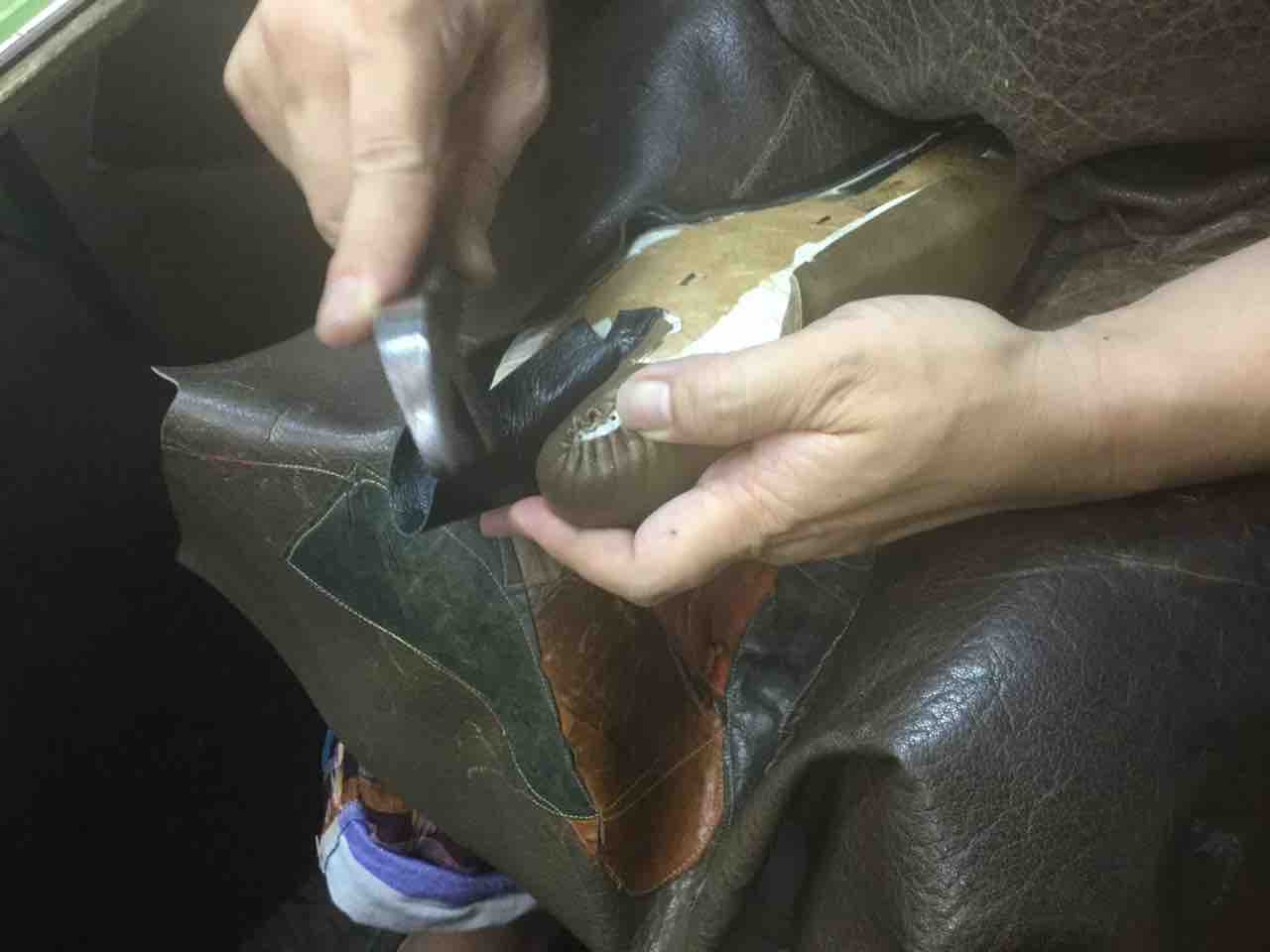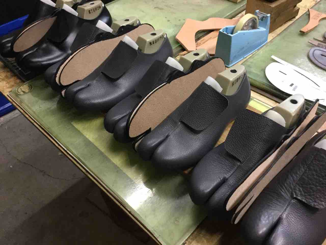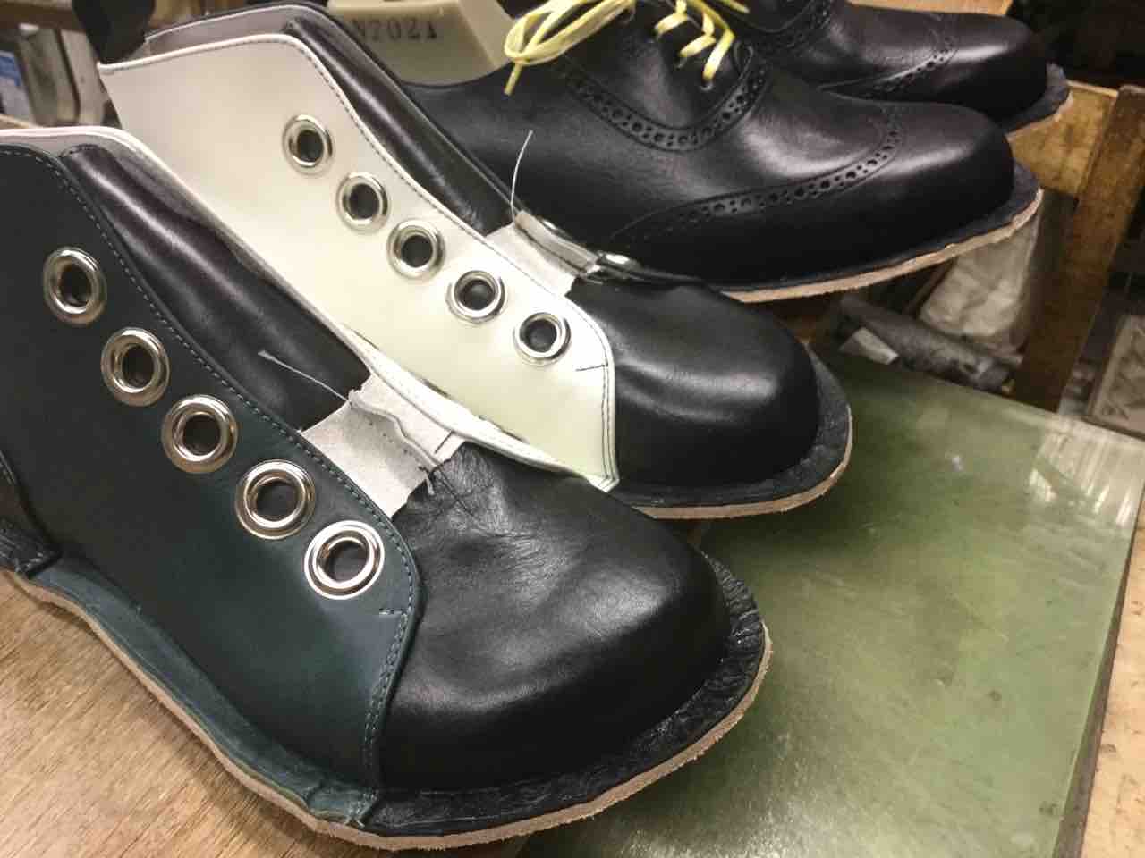 以前は自転車のゴムチューブを巻いて一晩置くというようなやり方をしていましたが、今は靴専用の圧着機を使っています。