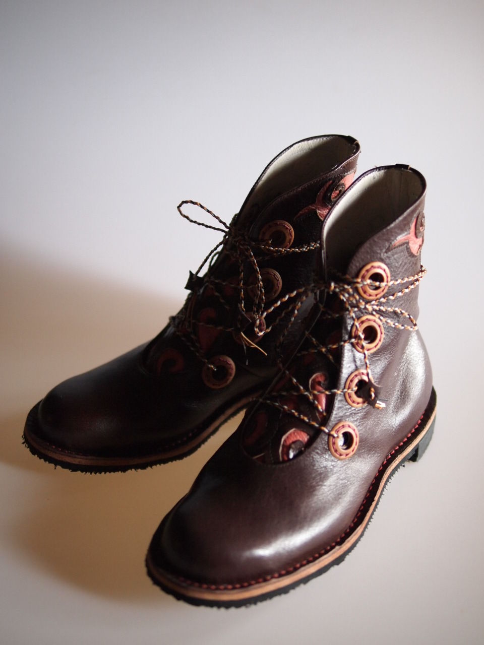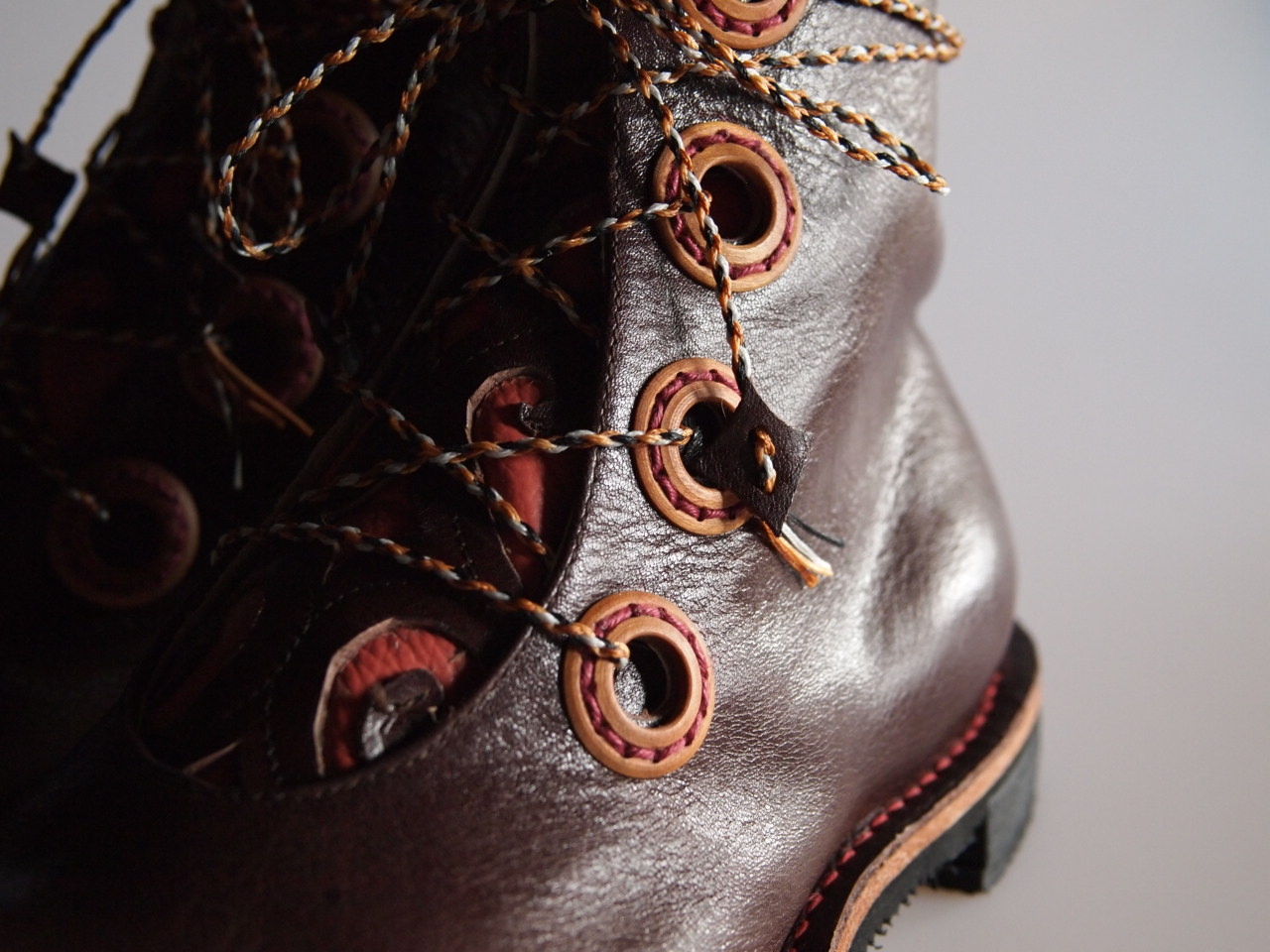 飾り切りしたベロと足首部分は別の革で裏当てして細部までミシンを施しました。