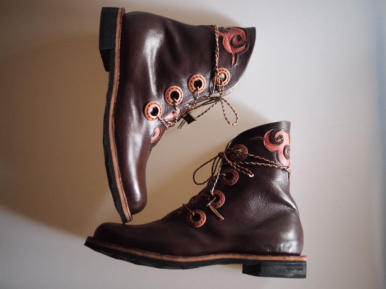 ベロと足首部分に飾り切りで模様を入れ、紐通し部分を木製のボタンを手縫い、紐も手編みで製作!