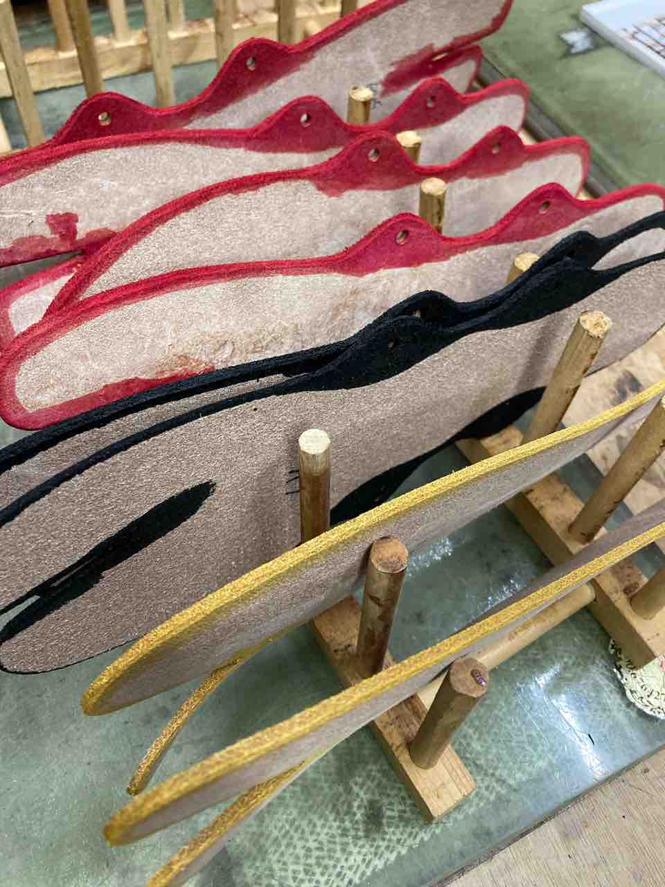 これらは全て手作業で裁断して、面取りなどの加工をした後に手作業で染めています。