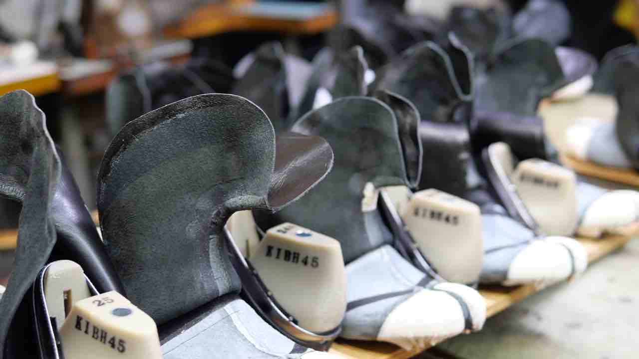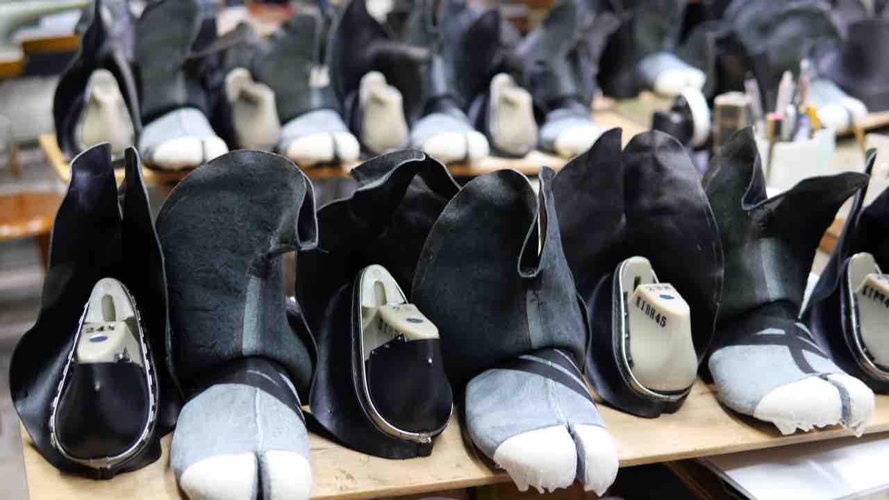 大きなメーカーではトゥラスターという機械で爪先の甲革・裏革・先芯を同時に釣り込みますが、足袋型はそもそも機械で作ることができませんので、一つ一つ順番にまとめていきます。