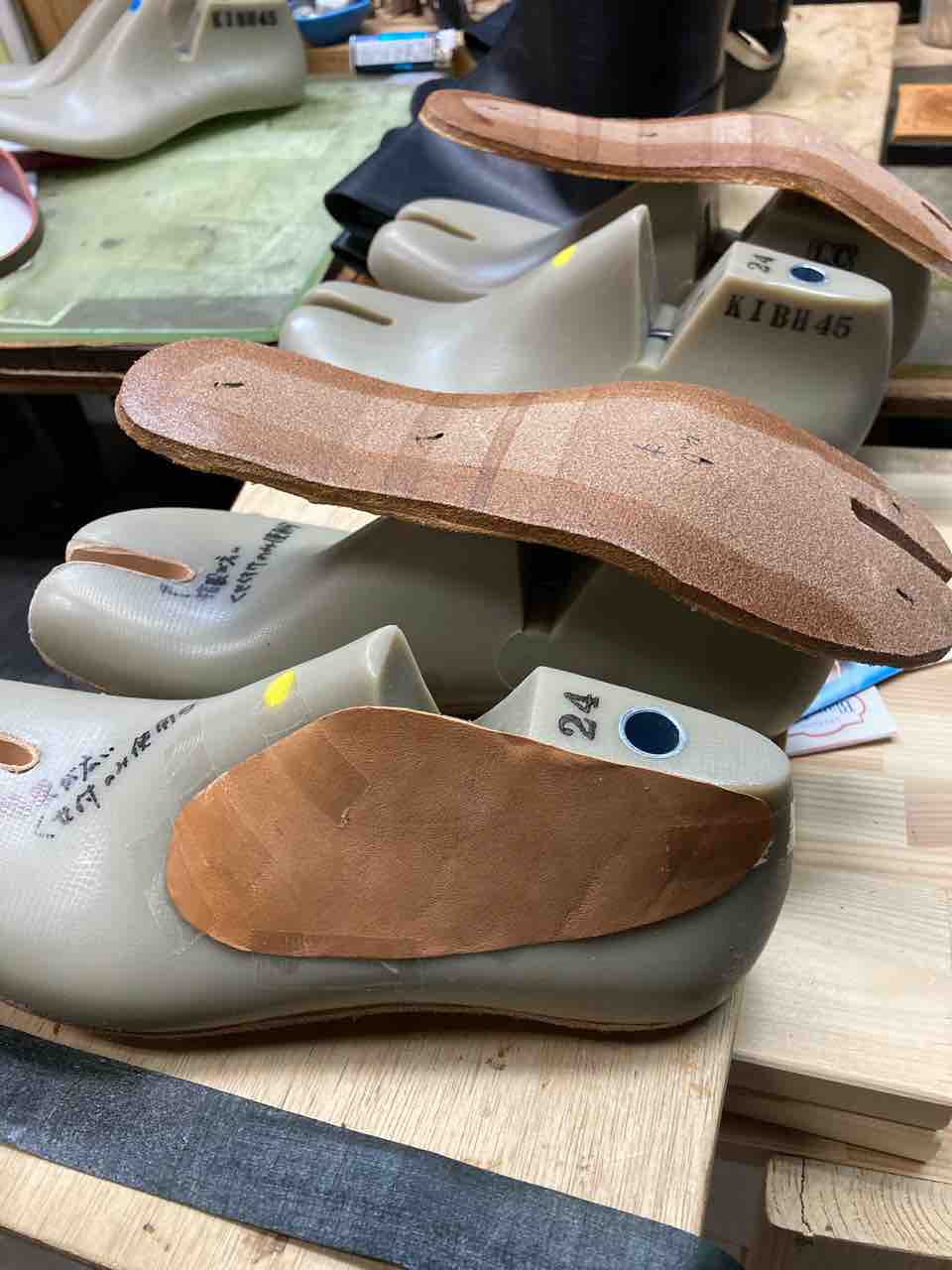 ご注文はいただいていて、既に何足か製作しているひの寸五のシリーズですが、工房の在庫が全く無い状態だったので、今月の阪急うめだでの催事に向けて作っております。