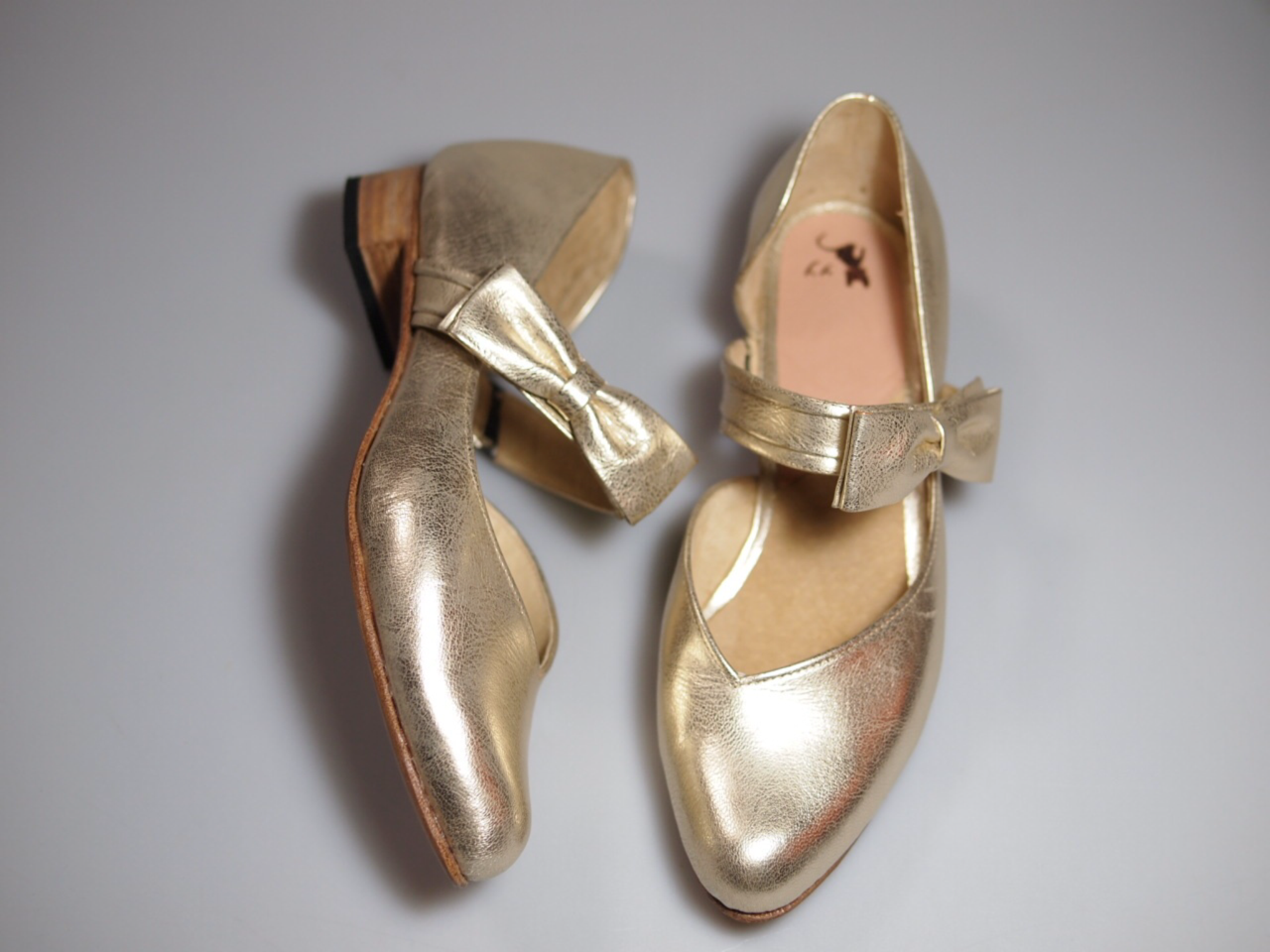 ゴールドの革でプリーツベルトにリボン付きという難易度の高いセパレートタイプのパンプスです。