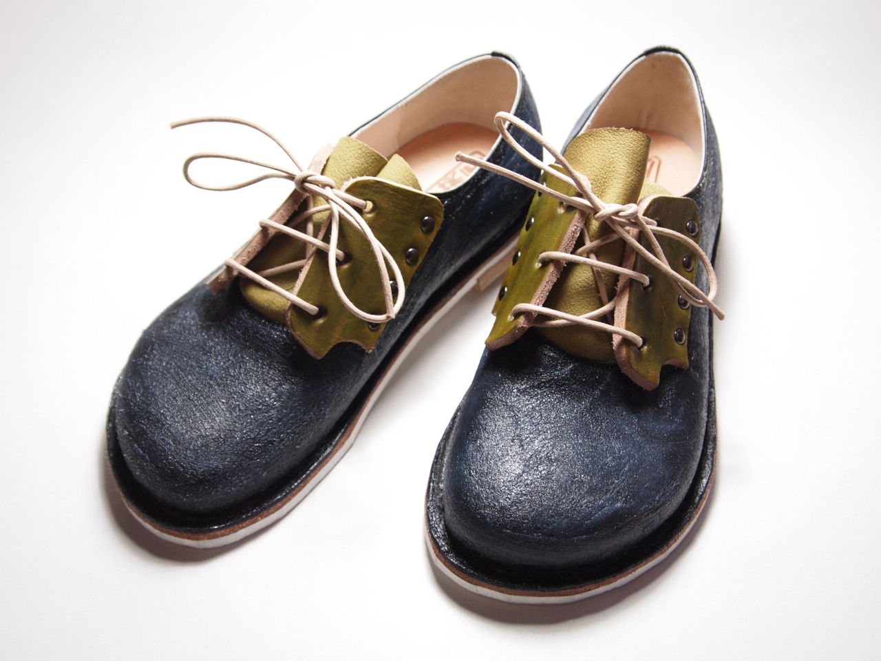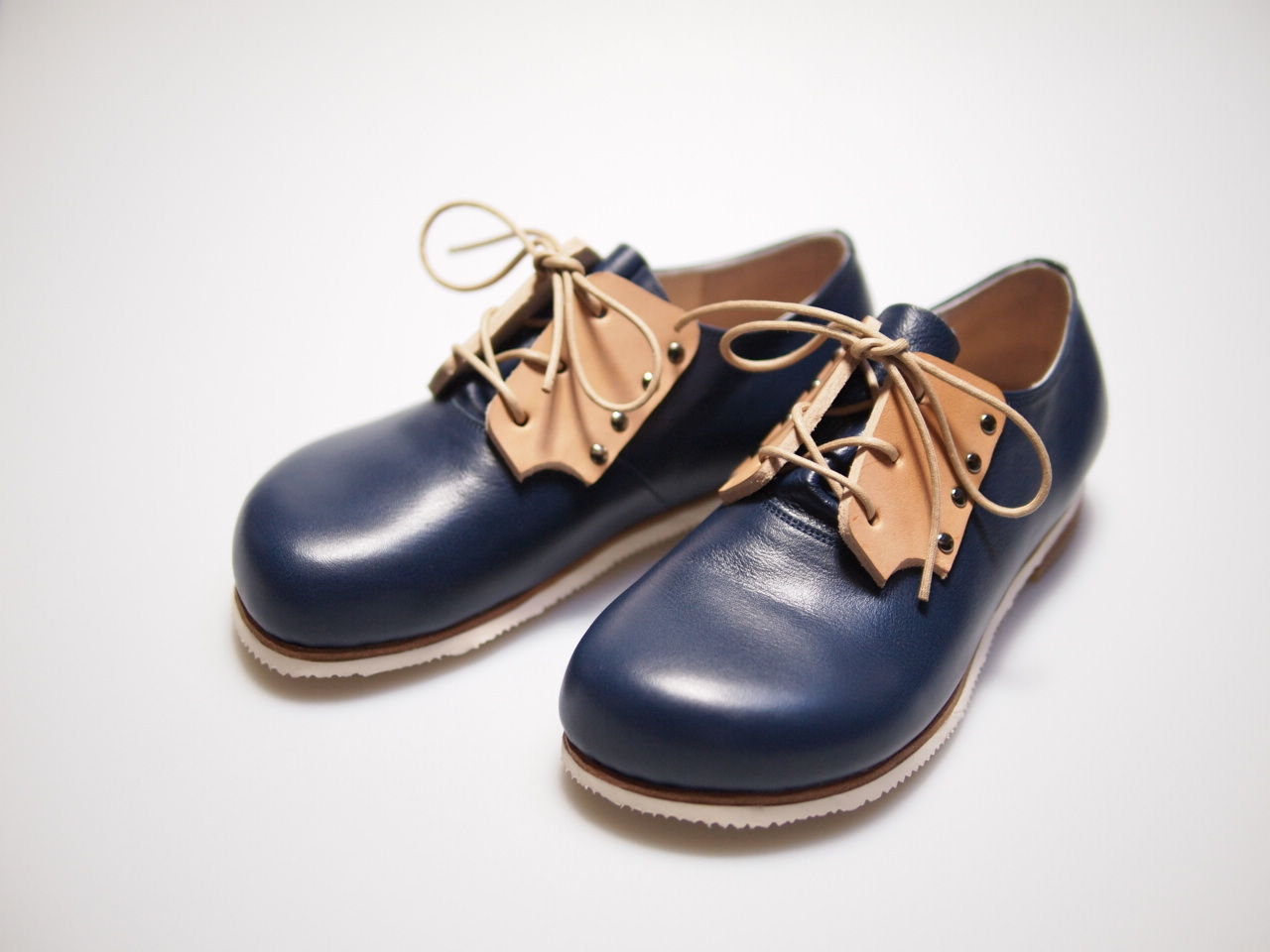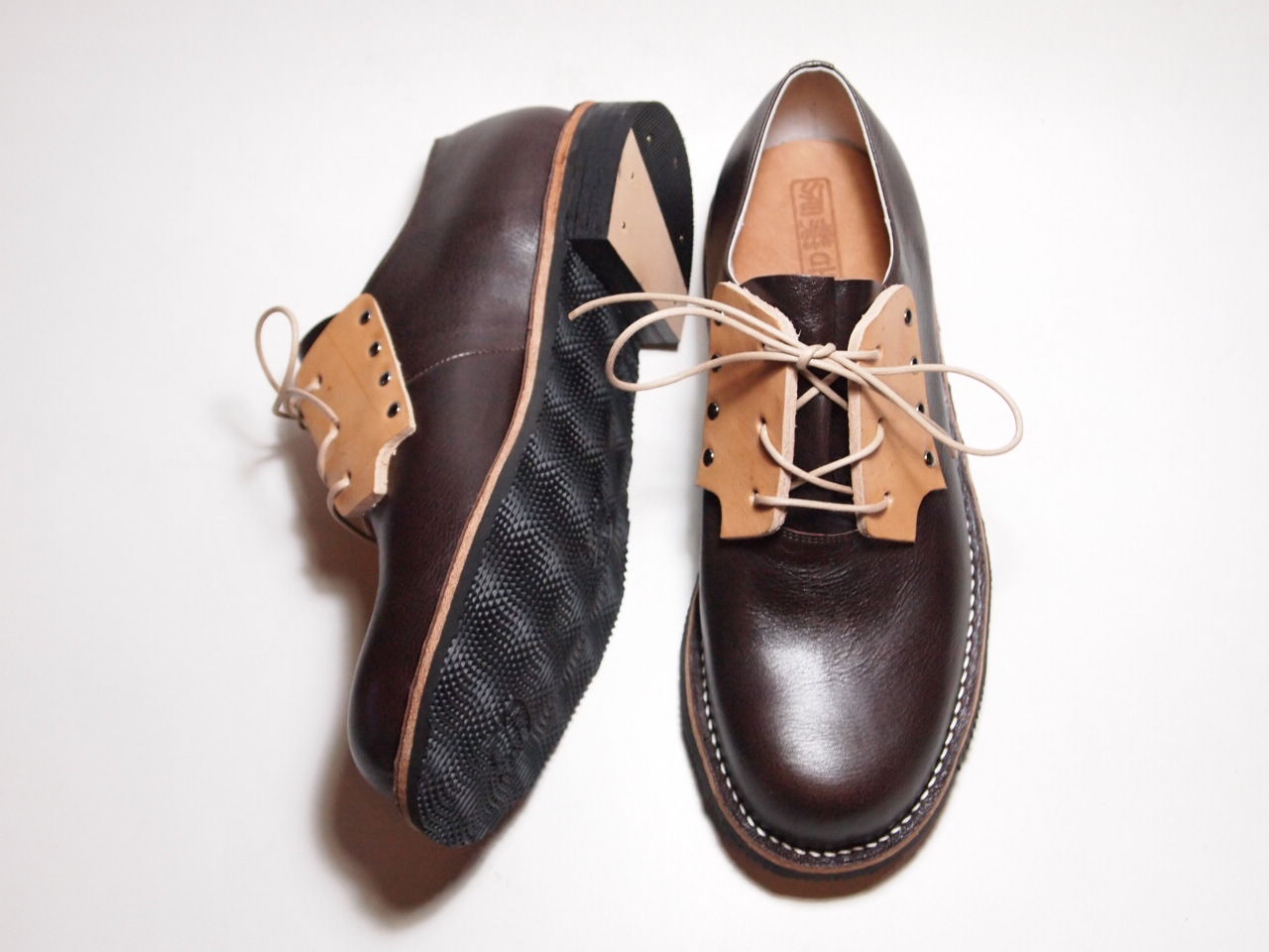 ヌメ革は吉靴房のメイン素材で分厚くて丈夫なので紐通しに使え、他で見ない表情にできると考えたので、この形に決まるまでに何度も何度も大きさや形を試作しました。