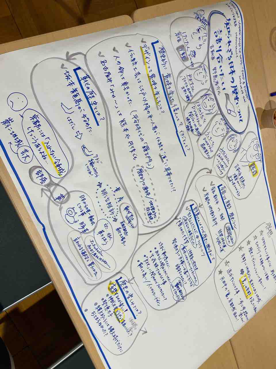 いくつかのテーブルに様々なテーマを携えた「亭主」役がいて、サポート役のグラフィックレコーディング担当の方と対話に参加される皆様の5〜6人の構成で約1時間の対話が行われました。