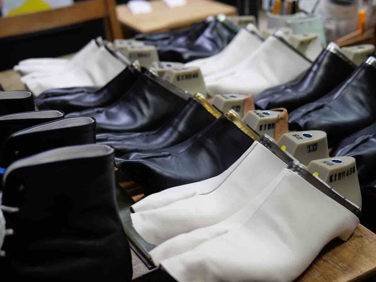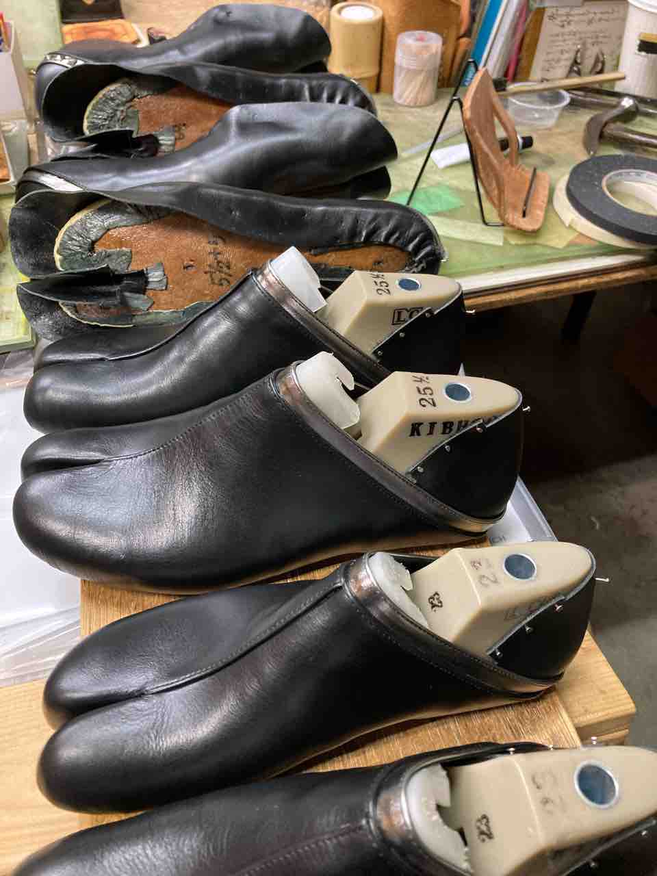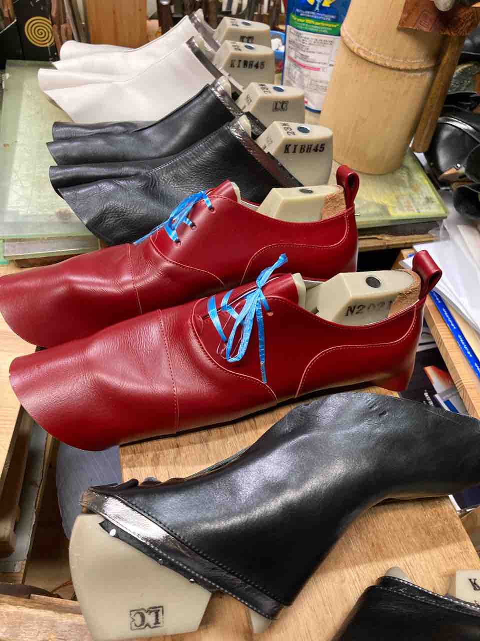 爪先の赤い革の部分も左右で合わせることが難しく、さらに足袋型なので爪先だけで4箇所合わせる必要があります。