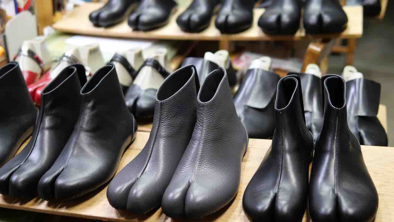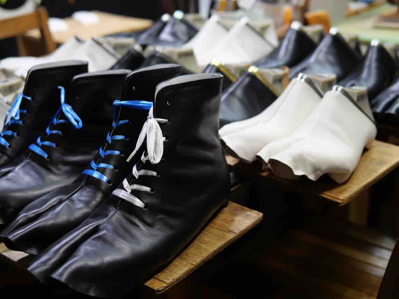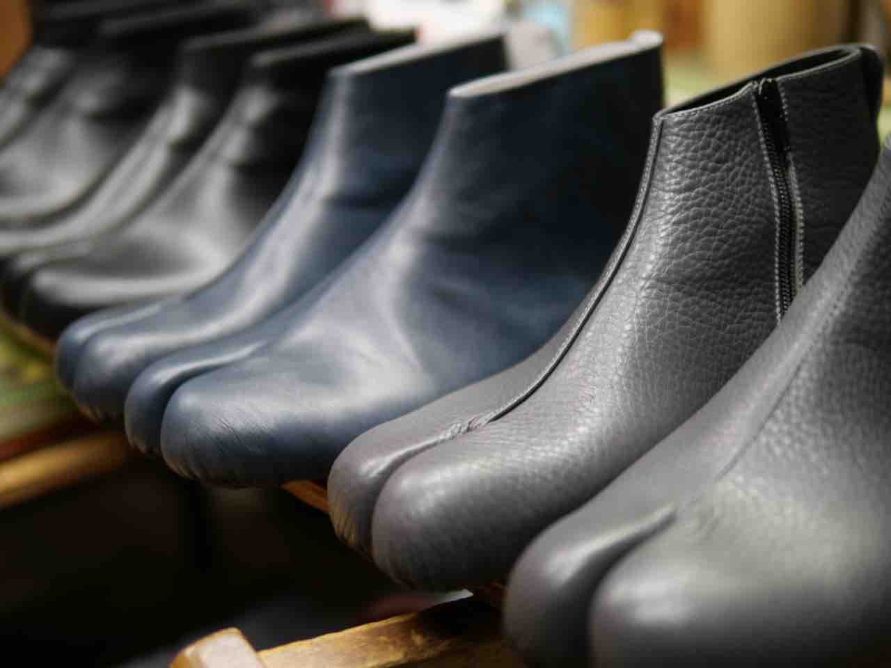 爪先の赤い革の部分も左右で合わせることが難しく、さらに足袋型なので爪先だけで4箇所合わせる必要があります。